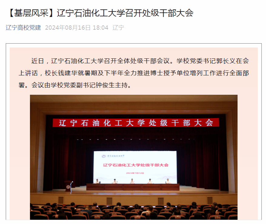 編者按:近日,學校召開全體處級干部會議,校黨委書記郭長義在會上講話,校長錢建華就暑期及下半年全力推進博士授予單位增列工作進行全面部署。遼寧高校黨建微信公眾號對對其進行了宣傳報道。現將相關報道轉載如下: