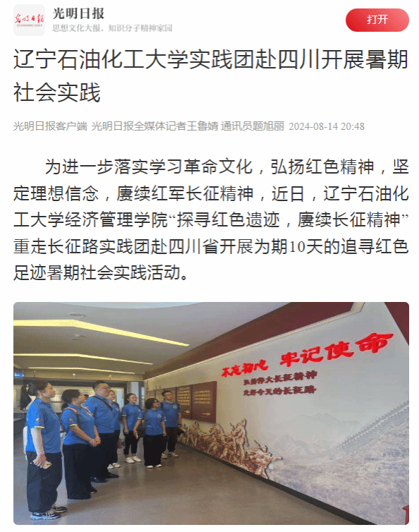 編者按:為進一步落實學習革命文化,弘揚紅色精神,堅定理想信念,賡續紅軍長征精神,近日,遼寧石油化工大學經濟管理學院“探尋紅色遺跡,賡續長征精神”重走長征路實踐團赴四川省開展為期10天的追尋紅色足跡暑期社會實踐活動。8月14日,光明日報客戶端對此進行了宣傳報道。現將相關報道轉載如下: