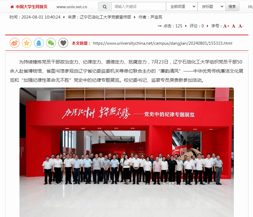 編者按:8月1日,中國大學生網、遼寧日報·遼望號、人民日報客戶端·人民號、搜狐號對我校組織黨員干部50余人赴省博物館、省圖書館參觀由遼寧省紀委監委機關等單位聯合主辦的“廉韻清風”——中華優秀傳統廉潔文化展覽和“加強紀律性革命無不勝”黨史中的紀律專題展覽進行了宣傳報道。現將相關報道轉載如下: