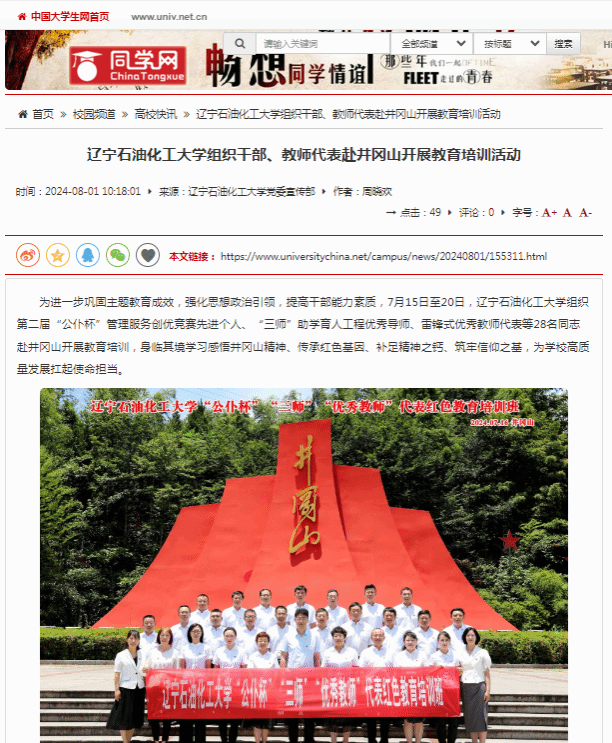 編者按:8月1日,遼寧日報·遼望號、中國大學生網、人民日報客戶端·人民號、搜狐號對我校組織第二屆“公仆杯”管理服務創優競賽先進個人、“三師”助學育人工程優秀導師、雷鋒式優秀教師代表等28名同志赴井岡山開展教育培訓,身臨其境學習感悟井岡山精神、傳承紅色基因、補足精神之鈣、筑牢信仰之基,為學校高質量發展扛起使命擔當進行了宣傳報道。現將相關報道轉載如下: