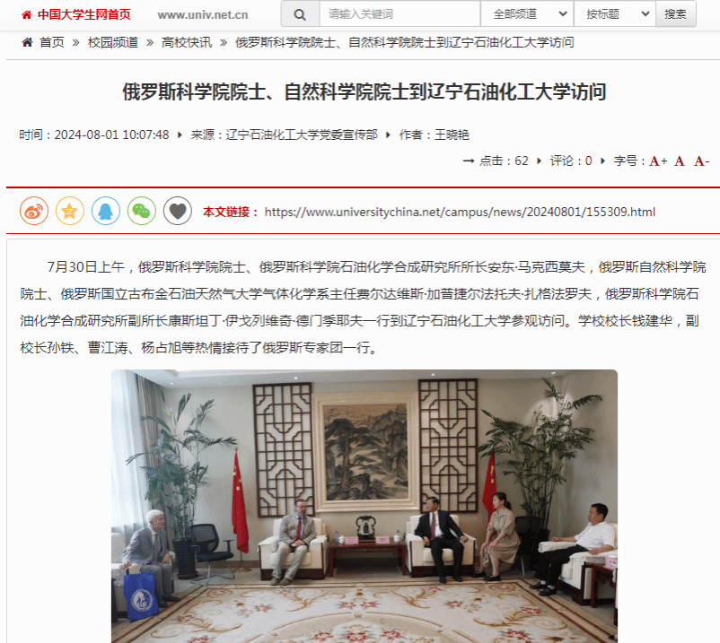 編者按:8月1日,遼寧日報·遼望號、中國大學生網、人民日報客戶端·人民號、搜狐號對俄羅斯科學院院士、俄羅斯科學院石油化學合成研究所所長安東·馬克西莫夫,俄羅斯自然科學院院士、俄羅斯國立古布金石油天然氣大學氣體化學系主任費爾達維斯·加普捷爾法托夫·扎格法羅夫,俄羅斯科學院石油化學合成研究所副所長康斯坦丁·伊戈列維奇·德門季耶夫一行到我校參觀訪問進行了宣傳報道。現將相關報道轉載如下: