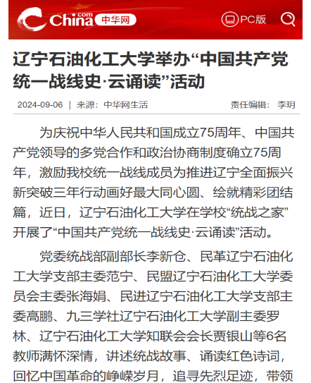 編者按:近日,中華網對我校黨委統戰部舉辦“中國共產黨統一戰線史·云誦讀”活動進行了宣傳報道。現將相關報道轉載如下: