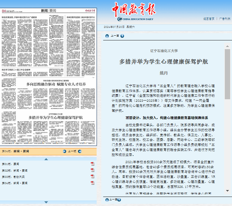 編者按:7月20日,中國教育報第4版對我校心理健康咨詢中心姚丹老師撰寫的文章《遼寧石油化工大學多措并舉為學生心理健康保駕護航》進行了刊發報道。現將相關報道轉載如下: