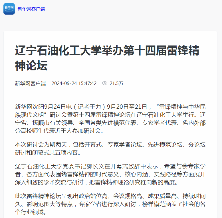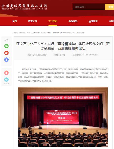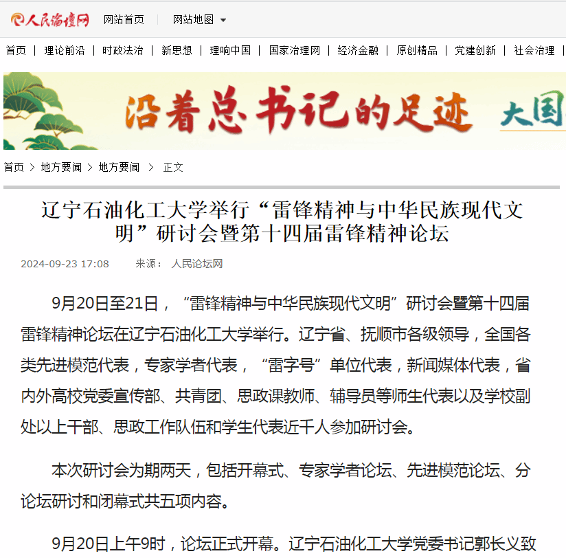 編者按:9月20日至21日,“雷鋒精神與中華民族現代文明”研討會暨第十四屆雷鋒精神論壇在遼寧石油化工大學舉行。遼寧省、撫順市各級領導,全國各類先進模范代表,專家學者代表,“雷字號”單位代表,新聞媒體代表,省內外高校黨委宣傳部、共青團、思政課教師、輔導員等師生代表以及學校副處以上干部、思政工作隊伍和學生代表近千人參加研討會。新華網客戶端、全國高校思想政治工作網、人民論壇網、遼寧高校思政微信公眾號、北斗融媒、東北新聞網、央視頻、撫順日報等媒體平臺對進行了宣傳報道。現將相關報道轉載如下: