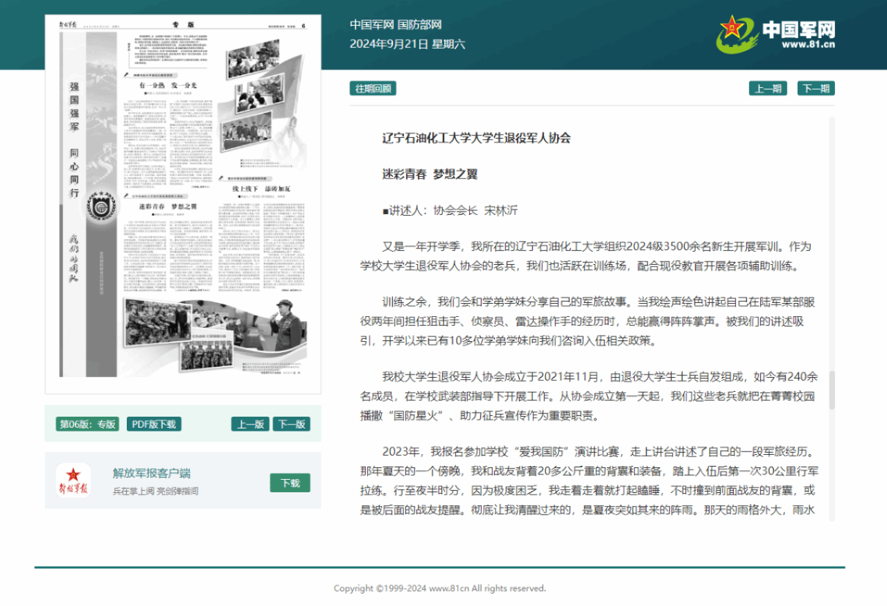 編者按:9月21日,解放軍報在紙媒和中國軍網(國防部網站)對我校大學生退役軍人協會相關事跡進行了宣傳報道。現將相關報道轉載如下: