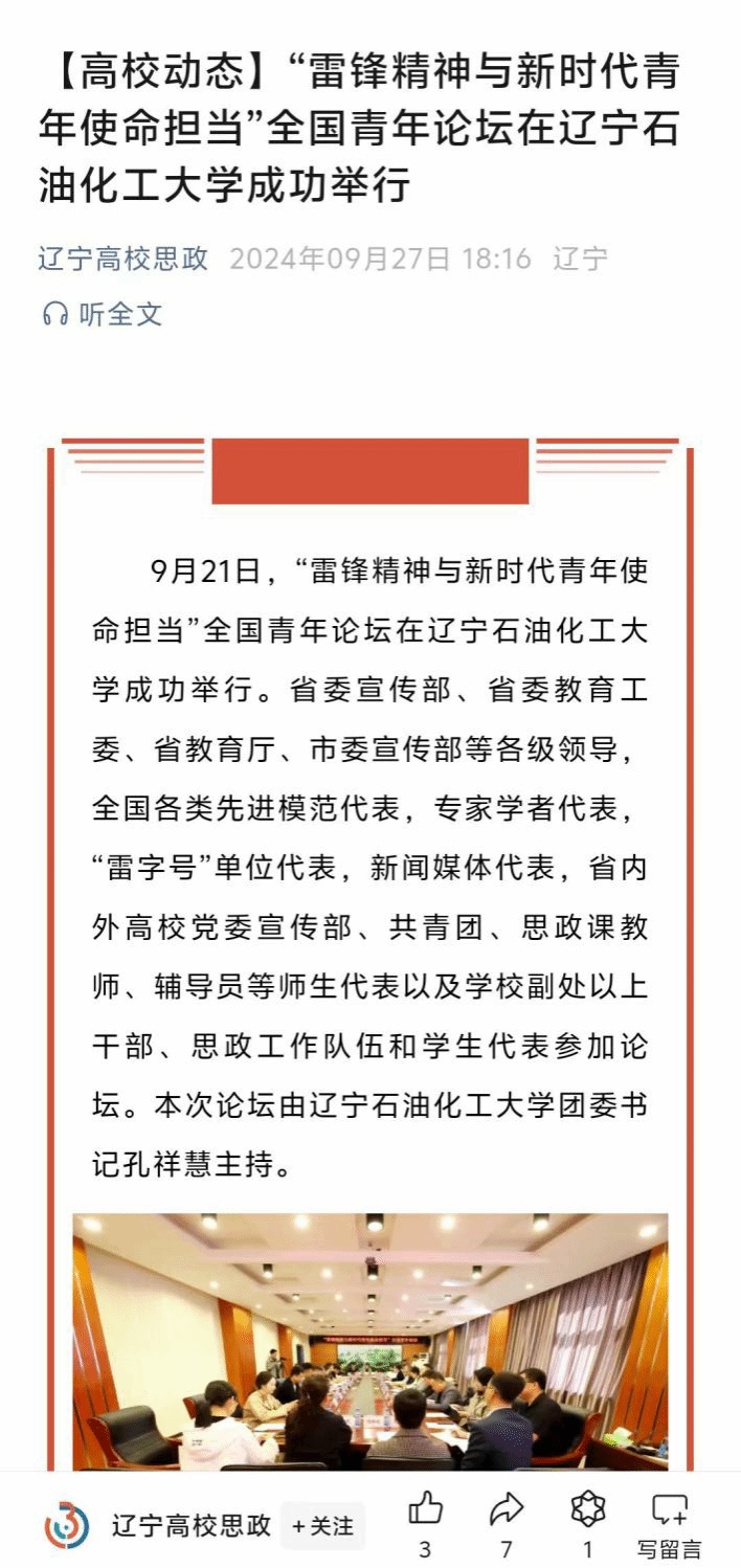 編者按:9月21日,“雷鋒精神與新時代青年使命擔當”全國青年論壇在遼寧石油化工大學成功舉行。遼寧高校思政微信公眾號對此進行了宣傳報道。現將相關報道轉載如下: