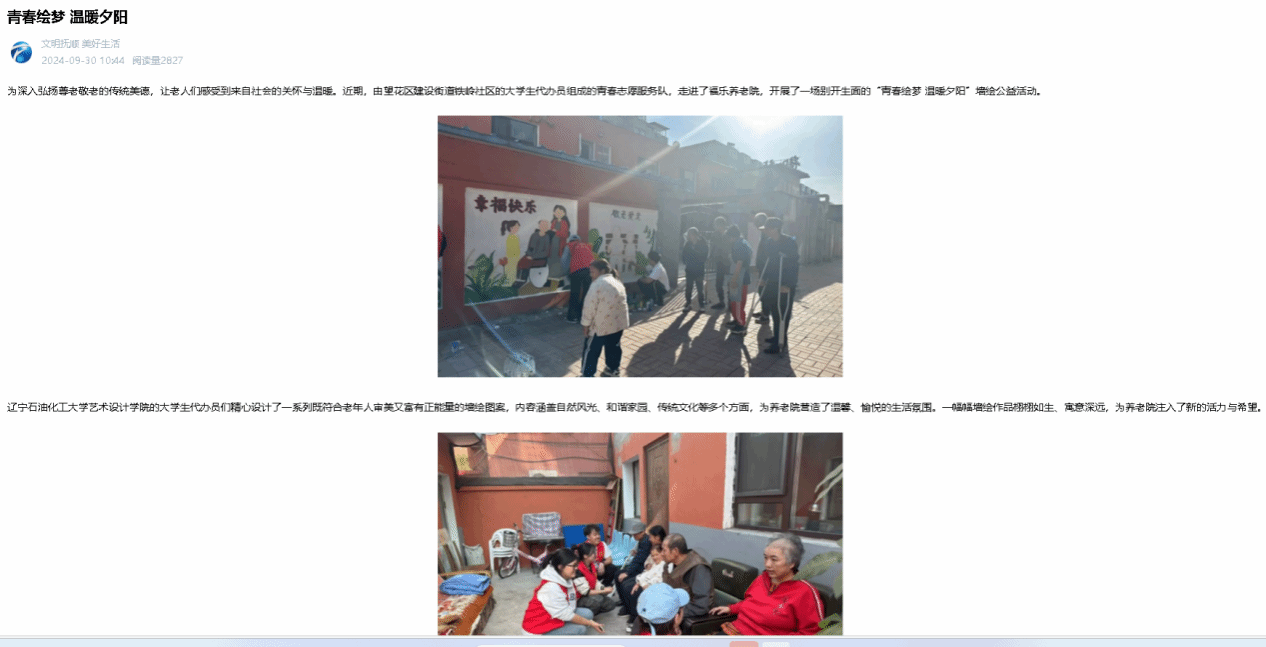 編者按:近日,遼寧石油化工大學藝術設計學院“撫”筆畫雷鋒 “油”彩繪遼寧”實踐隊走進望花建設街道福樂養老院,開展“青春繪夢 溫暖夕陽”墻繪公益活動,用實際行動詮釋著尊老敬老的中華傳統美德。現將相關報道轉載如下: