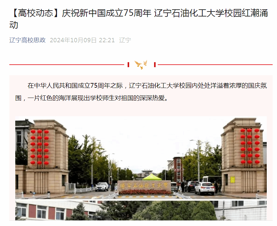 編者按:在中華人民共和國成立75周年之際,遼寧石油化工大學校園內處處洋溢著濃厚的國慶氛圍,一片紅色的海洋展現出學校師生對祖國的深深熱愛。遼寧高校思政微信公眾號對此進行了宣傳報道。現將相關報道轉載如下: