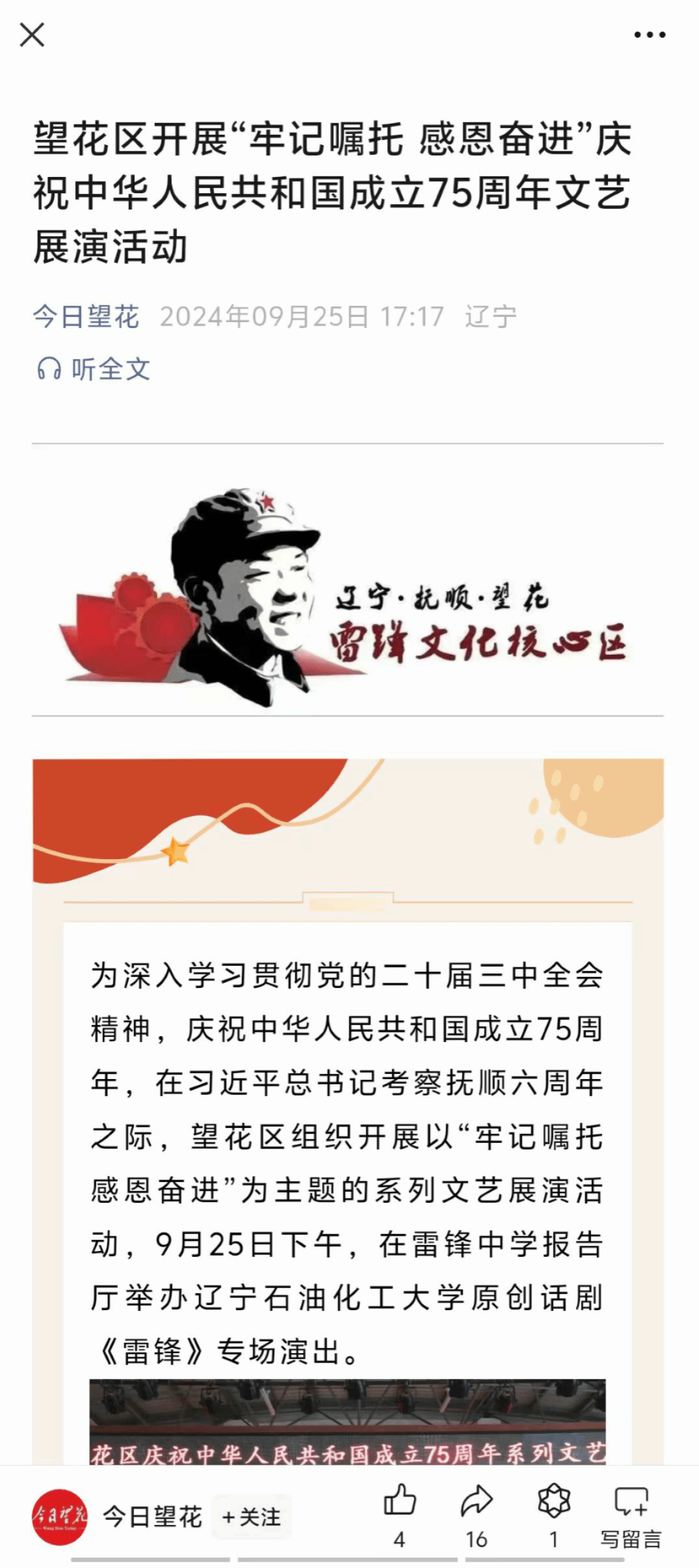 編者按:近日,撫順市望花區組織開展以“牢記囑托 感恩奮進”為主題的系列文藝展演活動,活動中,我校原創話劇《雷鋒》在雷鋒中學報告廳舉行專場演出。現將相關報道轉載如下: