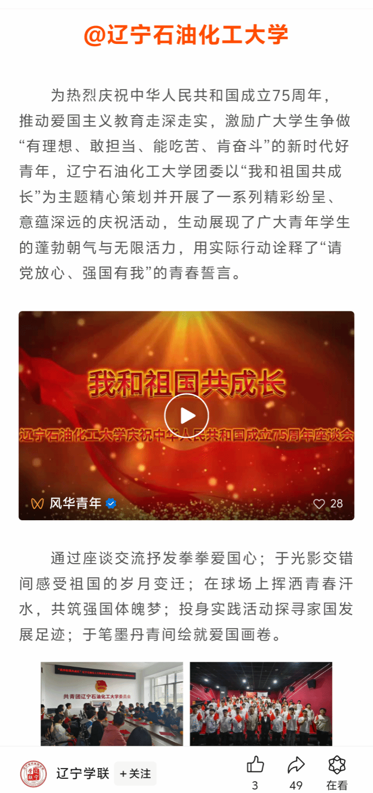 編者按:近日,遼寧學聯微信公眾號發文回顧遼寧高校學子與祖國同頻共振的精彩畫卷,其中對我校團委以“我和祖國共成長”為主題精心策劃并開展了一系列精彩紛呈、意蘊深遠的慶祝活動進行了組稿宣傳。現將相關報道轉載如下: