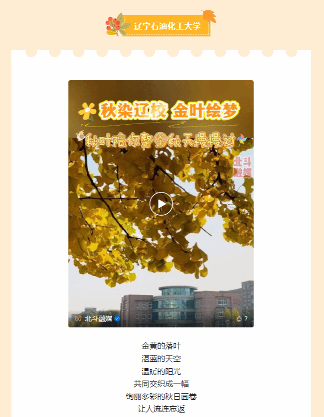 編者按:遼寧高校的秋日繽紛多彩深邃浪漫,北斗融媒發文對此進行了宣傳,其中收錄了我校的美麗秋景。現將相關報道轉載如下: