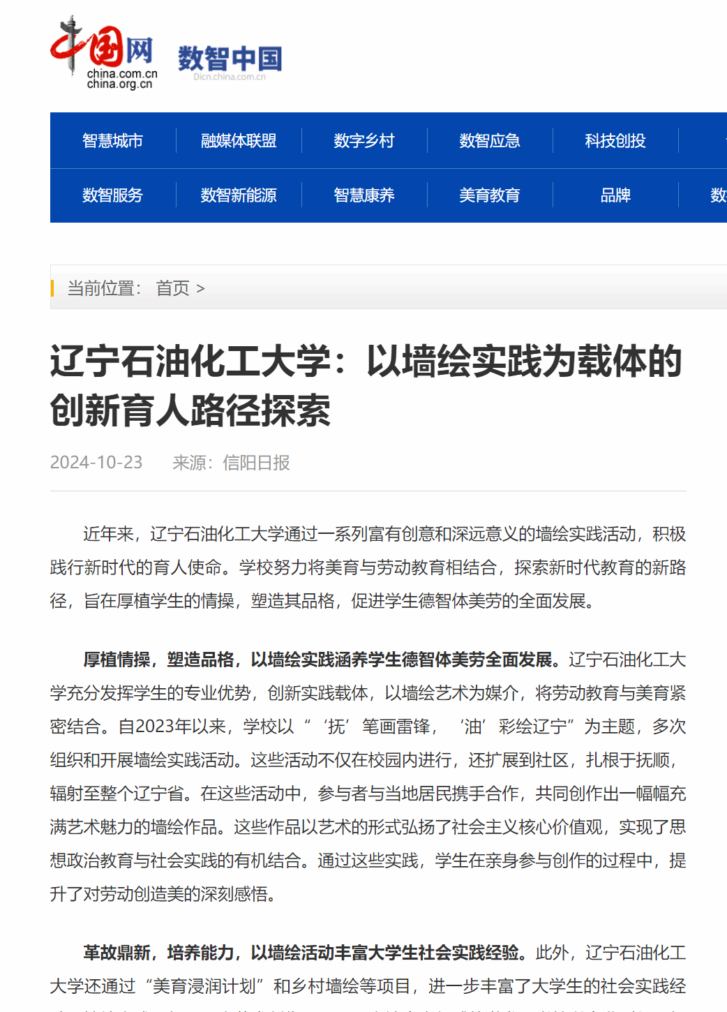 編者按:近日,我校藝術設計學院朱寅飛、曹光柱老師撰寫的文章《遼寧石油化工大學:以墻繪實踐為載體的創新育人路徑探索》在中國網(數智中國)、東北新聞網、遼寧黨建網發表,現將相關報道轉載如下: