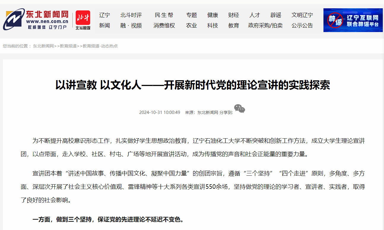 編者按:近日,我校經濟管理學院劉天冶老師撰寫的文章《以講宣教 以文化人——開展新時代黨的理論宣講的實踐探索 》在中國日報中文網、東北新聞網、遼寧黨建網發表,現將相關報道轉載如下: