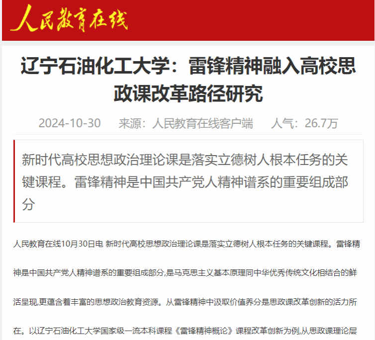 編者按:近日,人民教育在線(客戶端)、中國教育在線、中國晨報等媒體平臺對我校馬克思主義學院劉靜妍老師撰寫的《遼寧石油化工大學:雷鋒精神融入高校思想政治課改革路徑研究》文章進行了宣傳報道。現將相關報道轉載如下: