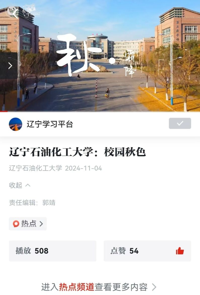 編者按:11月4日,學習強國主平臺-熱點欄目對我校新媒體中心學生趙英睿、郭金銘拍攝的視頻《遼寧石油化工大學:校園秋色》進行了宣傳。現將相關報道轉載如下: