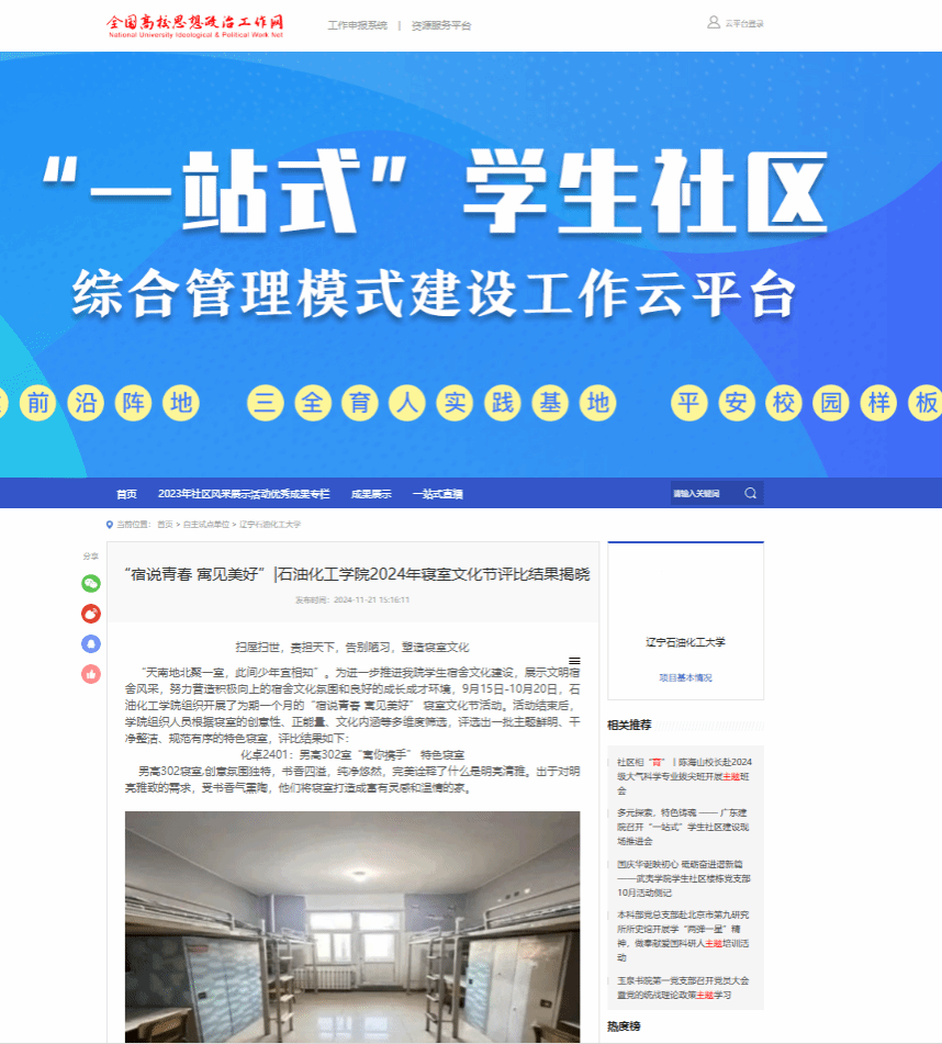 編者按:為進一步推進學生宿舍文化建設,展示文明宿舍風采,努力營造積極向上的宿舍文化氛圍和良好的成長成才環境,9月15日-10月20日,石油化工學院組織開展了為期一個月的“宿說青春 寓見美好”寢室文化節活動。11月21日,全國高校思想政治工作網對此次活動進行了報道,現將相關報道轉載如下: