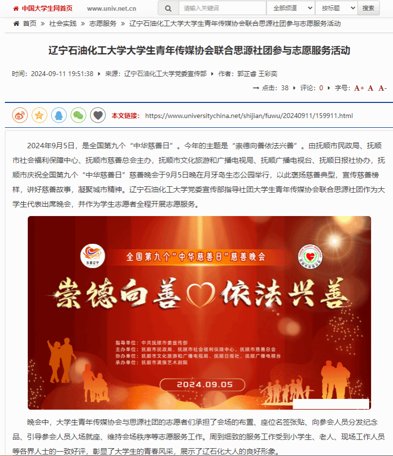 編者按:2024年9月5日,是第九個“中華慈善日”。今年的主題是“崇德向善依法興善”。由撫順市民政局、撫順市社會福利保障中心、撫順市慈善總會主辦,撫順市文化旅游和廣播電視局、撫順廣播電視臺、撫順日報社協辦,撫順市慶祝第九個“中華慈善日”慈善晚會于9月5日晚在月牙島生態公園舉行,以此褒揚慈善典型,宣傳慈善榜樣,講好慈善故事,凝聚城市精神。遼寧石油化工大學黨委宣傳部指導社團大學生青年傳媒協會聯合思源社團作為大學生代表出席晚會,并作為學生志愿者全程開展志愿服務。中國大學生網、人民日報客戶端?人民號、搜狐號對此進行了宣傳報道。現將相關報道轉載如下: