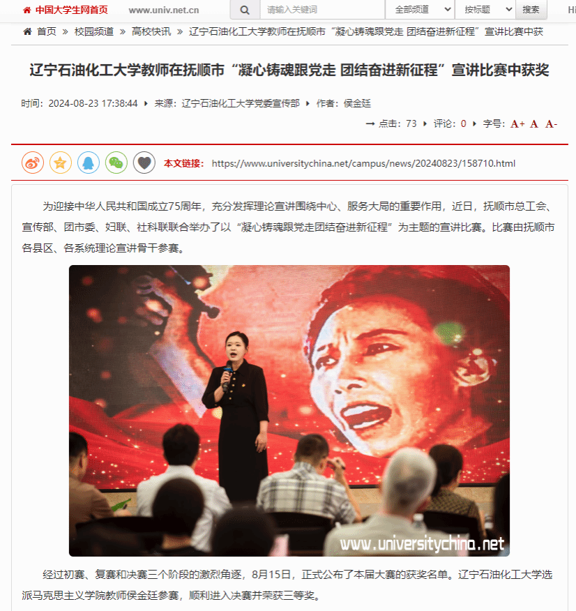 編者按:遼寧石油化工大學在撫順市“凝心鑄魂跟黨走 團結奮進新征程”宣講賽中獲佳績。中國大學生網、人民日報客戶端?人民號、搜狐號對此進行了宣傳報道。現將相關報道轉載如下: