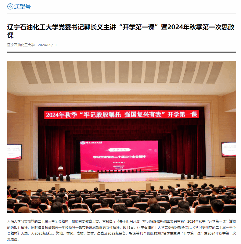 編者按:為深入學習貫徹黨的二十屆三中全會精神,按照省委教育工委、省教育廳《關于組織開展“牢記殷殷囑托強國復興有我”2024年秋季“開學第一課”活動的通知》精神,同時結合教育部關于學校領導干部帶頭講思政課的文件精神,9月5日,遼寧石油化工大學黨委書記郭長義以《學習貫徹黨的二十屆三中全會精神》為題,為2023級儲運、海油、材化、高材、復材、高卓及2022級裝備、智造等13個班級的387名學生主講“開學第一課”暨2024年秋季第一次思政課。中國大學生網、人民日報客戶端?人民號、遼寧日報?遼望號對此進行了宣傳報道。現將相關報道轉載如下: