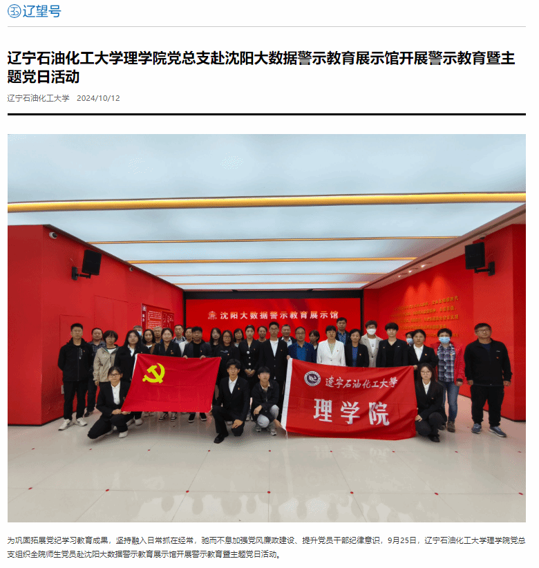 編者按:為鞏固拓展黨紀學習教育成果,堅持融入日常抓在經常,馳而不息加強黨風廉政建設、提升黨員干部紀律意識,9月25日,遼寧石油化工大學理學院黨總支組織全院師生黨員赴沈陽大數據警示教育展示館開展警示教育暨主題黨日活動。中國大學生網、遼寧日報?遼望號、搜狐號對此進行了宣傳報道。現將相關報道轉載如下: