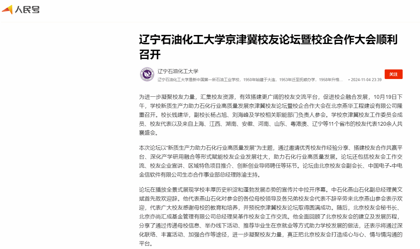 編者按:為進一步凝聚校友力量,匯集校友資源,有效搭建更廣闊的校友交流平臺,促進校企融合發展,10月19日下午,學校新質生產力助力石化行業高質量發展京津冀校友論壇暨校企合作大會在北京燕華工程建設有限公司隆重召開。人民日報客戶端?人民號、遼寧日報?遼望號對此進行了宣傳報道。現將相關報道轉載如下: