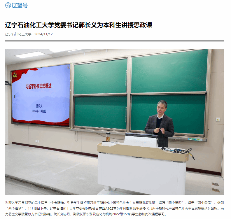 編者按:近日,學校黨委書記郭長義在四A102室為學校部分師生講授《習近平新時代中國特色社會主義思想概論》課程。遼寧日報?遼望號、搜狐號對此進行了宣傳報道。現將相關報道轉載如下: