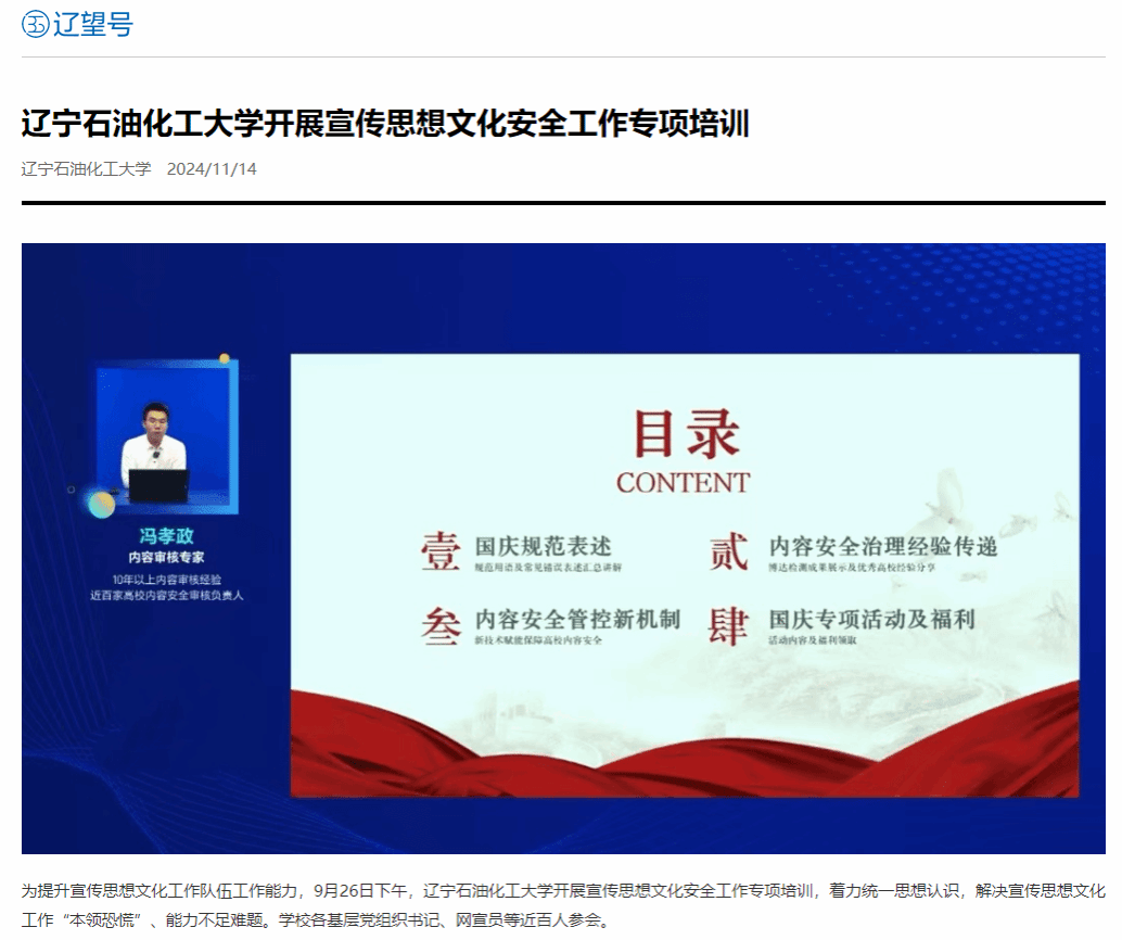 編者按:近日,為提升宣傳思想文化工作隊伍工作能力,學校開展宣傳思想文化安全工作專項培訓,著力統一思想認識,解決宣傳思想文化工作“本領恐慌”、能力不足難題。學校各基層黨組織書記、網宣員等近百人參會。遼寧日報?遼望號、搜狐號對此進行了宣傳報道。現將相關報道轉載如下: