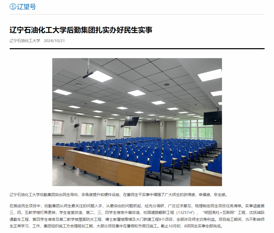 編者按:遼寧石油化工大學后勤集團突出民生導向,多角度提升軟硬件設施,在惠民生干實事中增強了廣大師生的獲得感、幸福感、安全感。中國大學生網、遼寧日報?遼望號、搜狐號對此進行了宣傳報道。現將相關報道轉載如下: