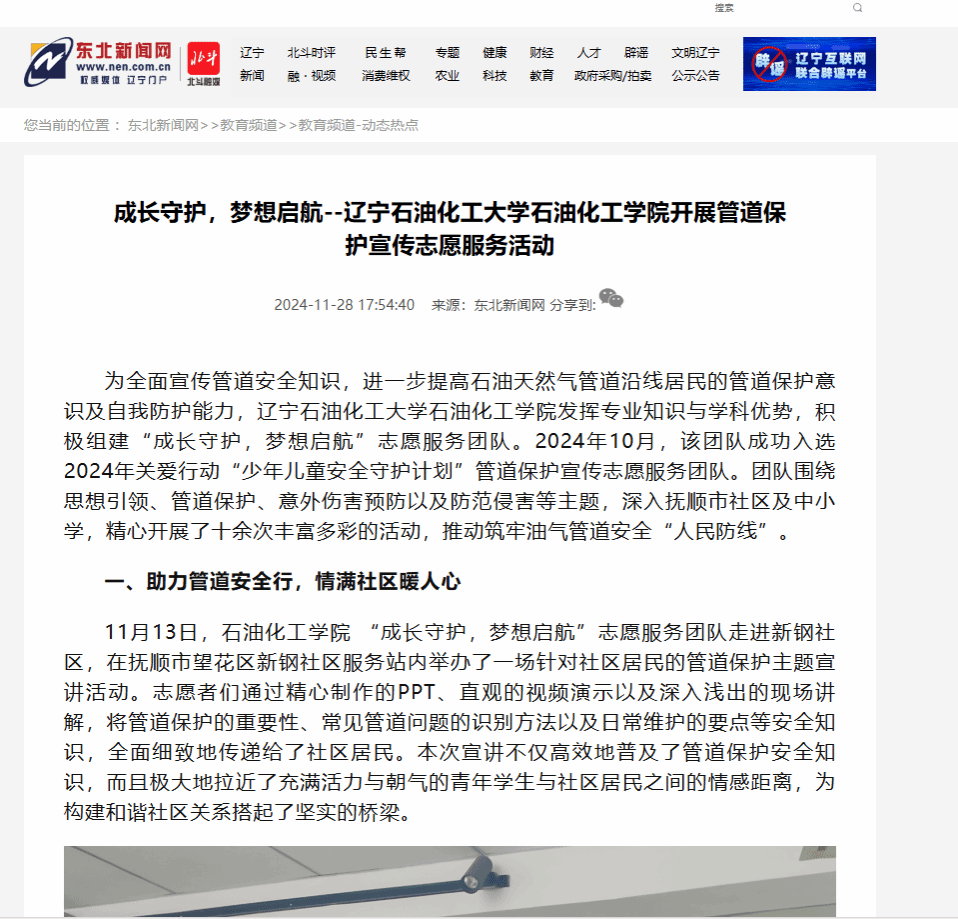 編者按:為全面宣傳管道安全知識,進一步提高石油天然氣管道沿線居民的管道保護意識及自我防護能力,遼寧石油化工大學石油化工學院發揮專業知識與學科優勢,積極組建“成長守護,夢想啟航”志愿服務團隊。團隊圍繞思想引領、管道保護、意外傷害預防以及防范侵害等主題,深入撫順市社區及中小學,精心開展了十余次豐富多彩的活動,推動筑牢油氣管道安全“人民防線”。北斗融媒對此進行了報道,現將相關報道轉載如下: