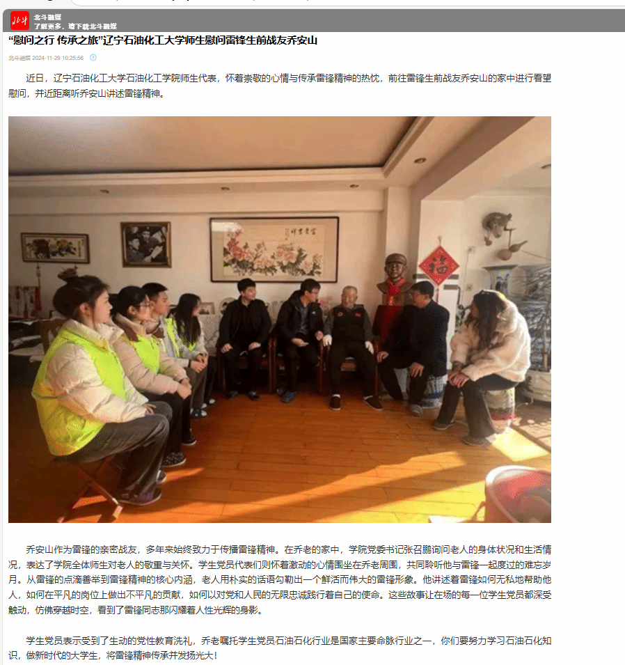 編者按:近日,石油化工學院師生代表,懷著崇敬的心情與傳承雷鋒精神的熱忱,前往雷鋒生前戰友喬安山的家中進行看望慰問,并近距離聽喬安山講述雷鋒精神。11月29日,北斗融媒對此進行了報道,現將相關報道轉載如下: