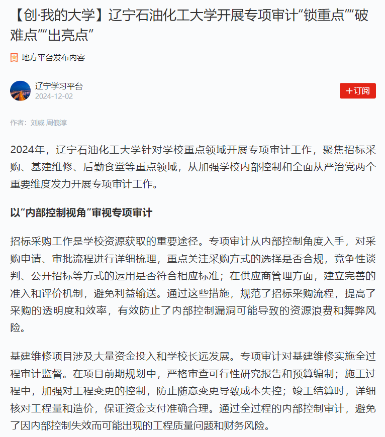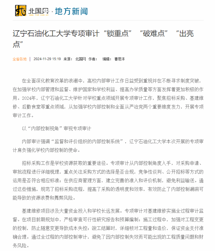 編者按: 2024年,遼寧石油化工大學針對學校重點領域開展專項審計工作,聚焦招標采購、基建維修、后勤食堂等重點領域,從加強學校內部控制和全面從嚴治黨兩個重要維度發力,開展專項審計工作。學習強國遼寧學習平臺、北國網對此進行了宣傳。現將相關報道轉載如下: