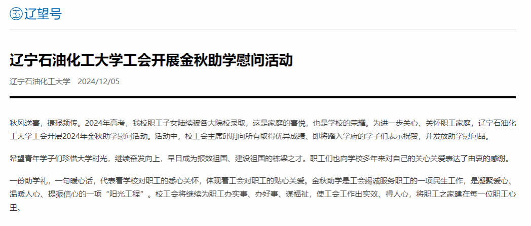 編者按:為進一步關心、關懷職工家庭,遼寧石油化工大學工會開展2024年金秋助學慰問活動。活動中,校工會主席邱玥向所有取得優異成績、即將踏入學府的學子們表示祝賀,并發放助學慰問品。遼寧日報?遼望號、中國大學生網、人民日報客戶端?人民號、搜狐號對此進行了宣傳報道。現將相關報道轉載如下: