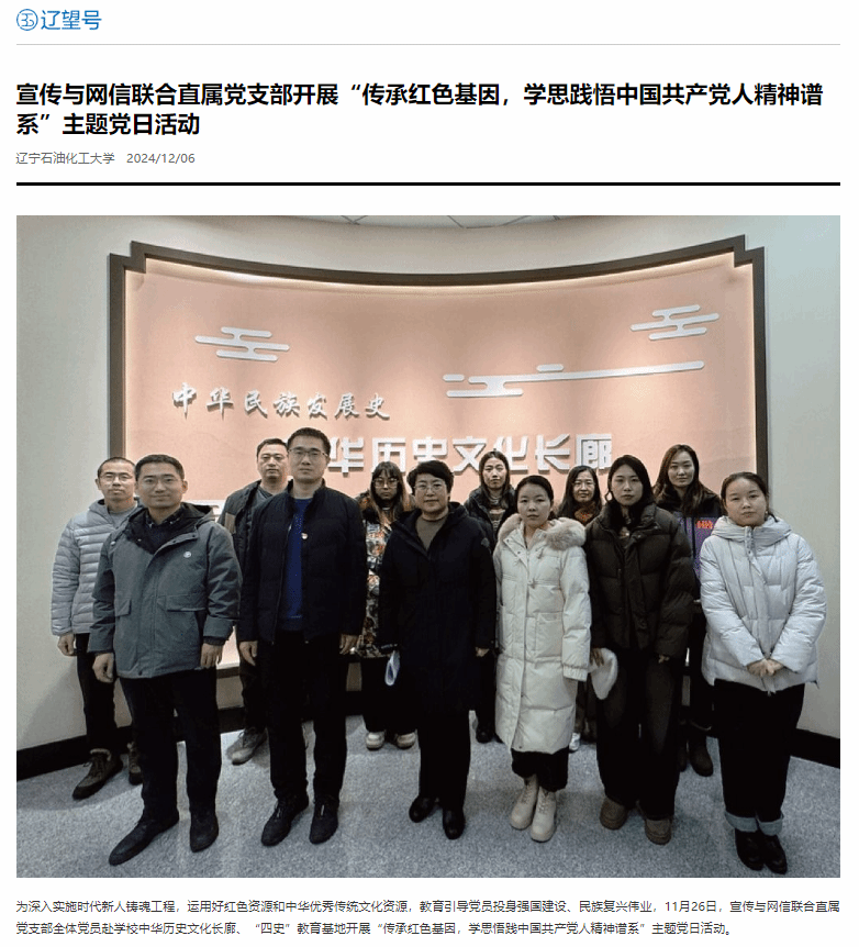 編者按:為深入實施時代新人鑄魂工程,運用好紅色資源和中華優秀傳統文化資源,教育引導黨員投身強國建設、民族復興偉業,11月26日,宣傳與網信聯合直屬黨支部全體黨員赴學校中華歷史文化長廊、“四史”教育基地開展“傳承紅色基因,學思悟踐中國共產黨人精神譜系”主題黨日活動。遼寧日報?遼望號對此進行了宣傳報道。現將相關報道轉載如下: