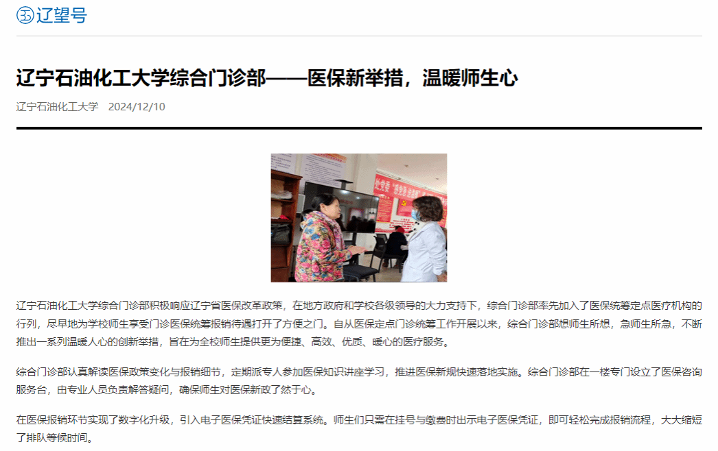 編者按:遼寧石油化工大學綜合門診部積極響應遼寧省醫保改革政策,在地方政府和學校各級領導的大力支持下,綜合門診部率先加入了醫保統籌定點醫療機構的行列,盡早地為學校師生享受門診醫保統籌報銷待遇打開了方便之門。自從醫保定點門診統籌工作開展以來,綜合門診部想師生所想,急師生所急,不斷推出一系列溫暖人心的創新舉措,旨在為全校師生提供更為便捷、高效、優質、暖心的醫療服務。遼寧日報?遼望號對此進行了宣傳報道。現將相關報道轉載如下:
