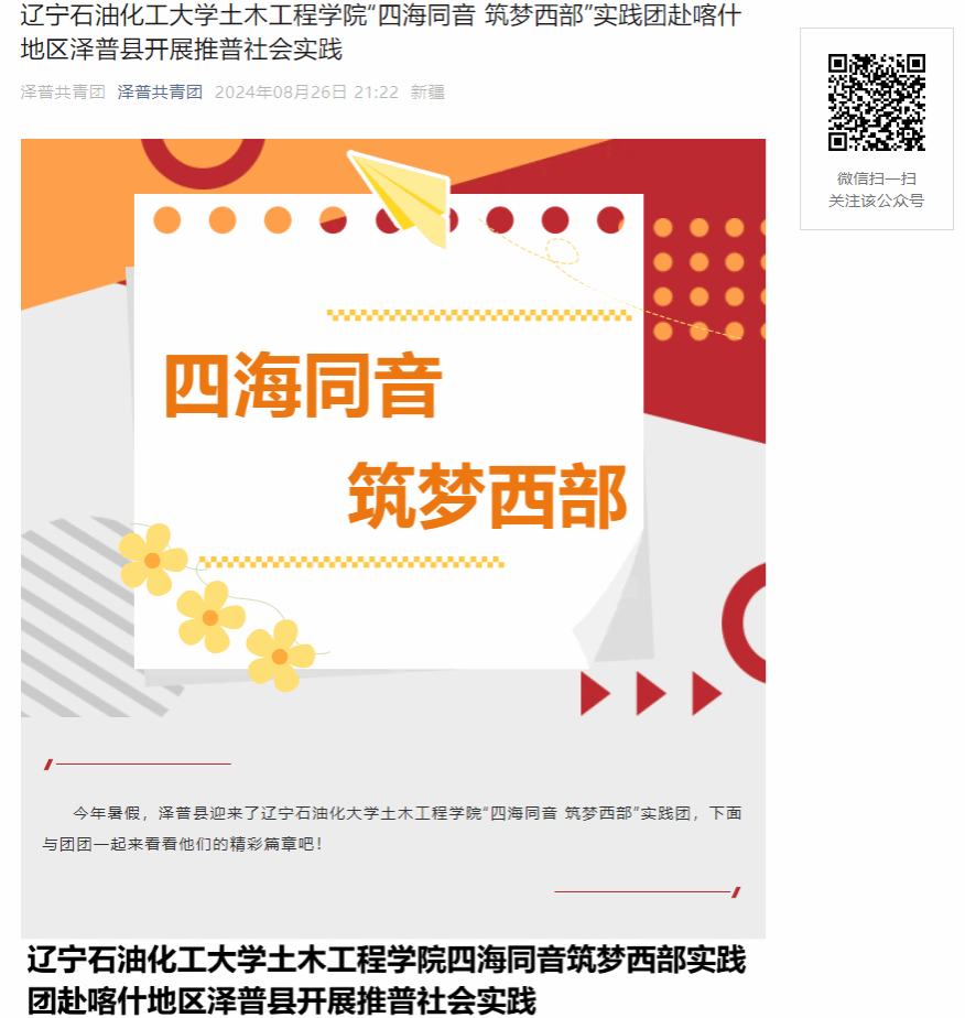 編者按:土木工程學院“四海同音 筑夢西部”實踐團赴喀什地區澤普縣開展推普社會實踐。澤普共青團微信公眾號、中教網、大學生云報、推普助力鄉村振興微信公眾平臺、人民網?人民號對此進行了宣傳報道。現將相關報道轉載如下: