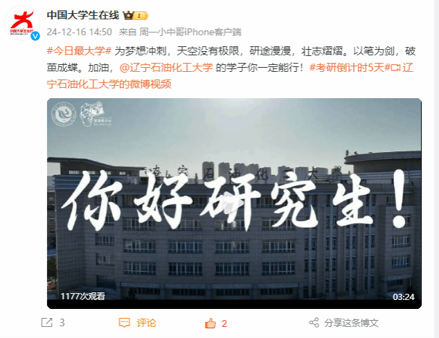 編者按:考研倒計時5天,學校新媒體中心制作視頻祝福學子考研成功。教育部中國大學生在線官方微博對此進行了轉發宣傳。現將相關報道轉載如下: