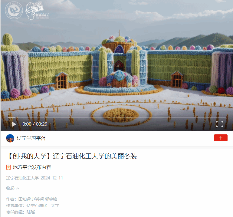 編者按:近日,學習強國遼寧學習平臺對我校新媒體中心學生田知睿、趙英睿、郭金銘制作的視頻《遼寧石油化工大學的美麗冬裝》進行了宣傳報道。現將報道轉載如下:
