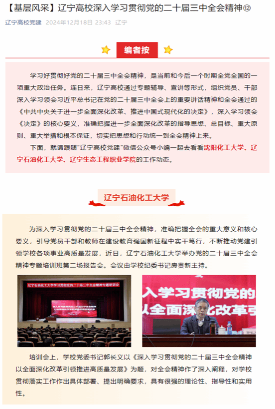 編者按:學習好貫徹好黨的二十屆三中全會精神,是當前和今后一個時期全黨全國的一項重大政治任務。連日來,遼寧高校通過專題輔導、宣講等形式,組織黨員、干部深入學習領會習近平總書記在黨的二十屆三中全會上的重要講話精神和全會通過的《中共中央關于進一步全面深化改革、推進中國式現代化的決定》,深入學習領會《決定》的核心要義。12月18日,遼寧高校黨建微信公眾號對我校舉辦黨的二十屆三中全會精神專題培訓班第二場報告會進行了組稿宣傳報道。現將相關報道轉載如下: