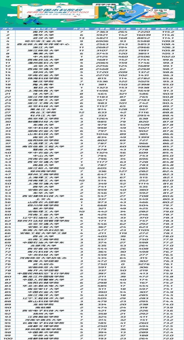 編者按:“全國高校視頻號影響力指數”由中國青年報中青校媒發布,中青華云數據支持。2024年3月5日,中青校媒微信公眾號發布全國高校(本科院校/職業院校)視頻號影響力指數(2024.2.26-2024.3.3),我校成功上榜。現將相關報道轉載如下: