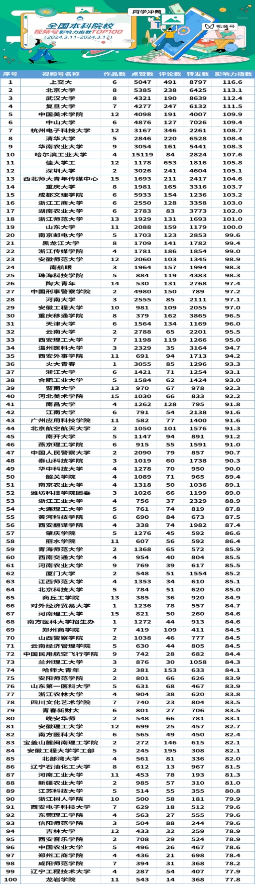 編者按: “全國高校視頻號影響力指數”由中國青年報中青校媒發布,中青華云數據支持。2024年3月19日,中青校媒微信公眾號發布全國高校(本科院校/職業院校)視頻號影響力指數(2024.3.11-2024.3.17),我校成功上榜。現將相關報道轉載如下: