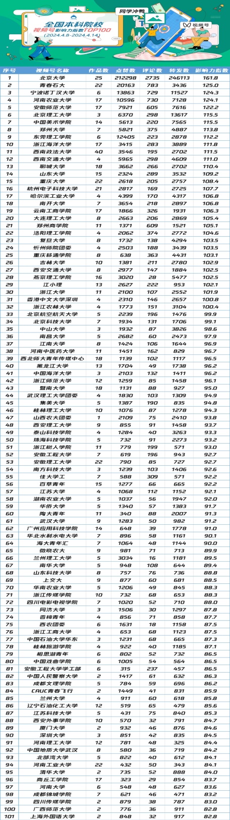 編者按:“全國高校視頻號影響力指數”由中國青年報中青校媒發布,中青華云數據支持。2024年4月17日,中青校媒微信公眾號發布全國高校(本科院校/職業院校)視頻號影響力指數(2024.4.8-2024.4.14),我校成功上榜。現將相關報道轉載如下: