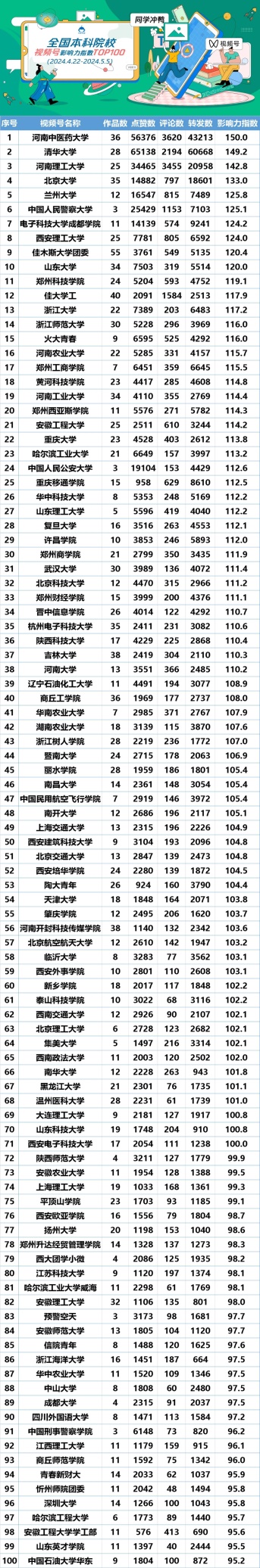 編者按:“全國高校視頻號影響力指數”由中國青年報中青校媒發布,中青華云數據支持。2024年5月8日,中青校媒微信公眾號發布全國高校(本科院校/職業院校)視頻號影響力指數(2024.4.22-2024.5.5),我校成功上榜。現將相關報道轉載如下: