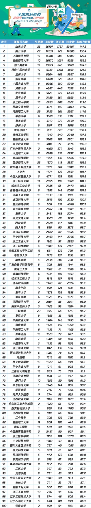 編者按:“全國高校視頻號影響力指數”由中國青年報中青校媒發布,中青華云數據支持。2024年10月22日,中青校媒微信公眾號發布全國高校(本科院校/職業院校)視頻號影響力指數(2024.10.14-2024.10.20),我校成功上榜。現將相關報道轉載如下: