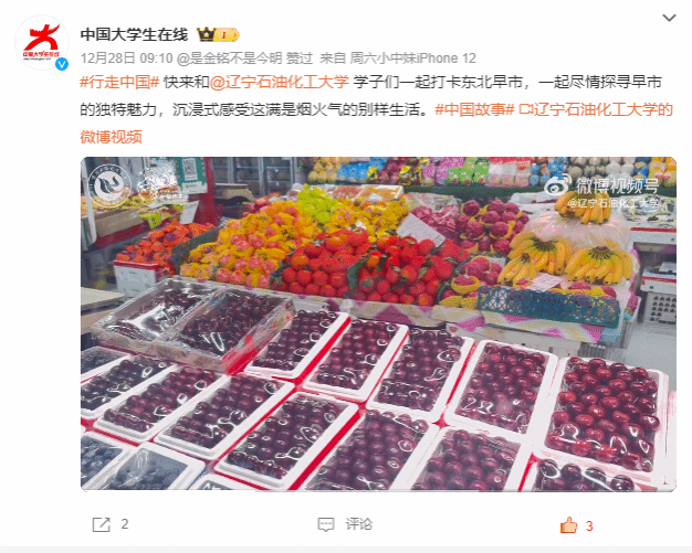 編者按:12月28日,教育部中國大學生在線官方微博轉發我校新媒體學生制作的打卡東北早市視頻。現將相關報道轉載如下: