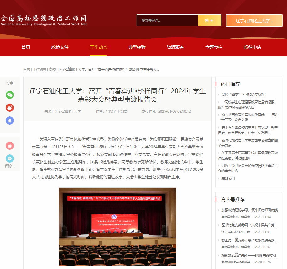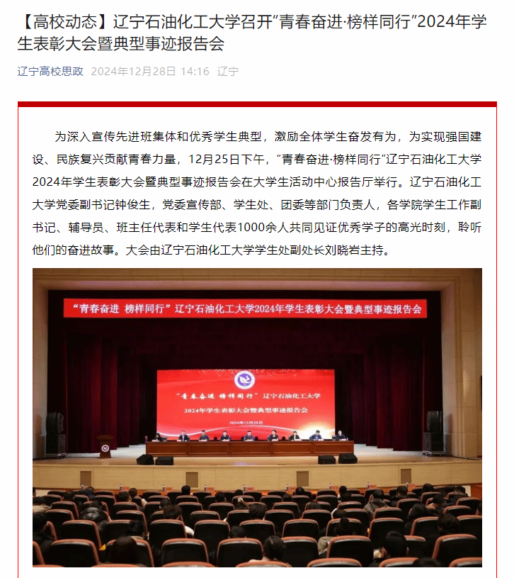 編者按:為深入宣傳先進班集體和優秀學生典型,激勵全體學生奮發有為,為實現強國建設、民族復興貢獻青春力量,12月25日下午,“青春奮進·榜樣同行”遼寧石油化工大學2024年學生表彰大會暨典型事跡報告會在大學生活動中心報告廳舉行。全國高校思想政治工作網、遼寧高校思政微信公眾號對此進行了宣傳報道。現將相關報道轉載如下: