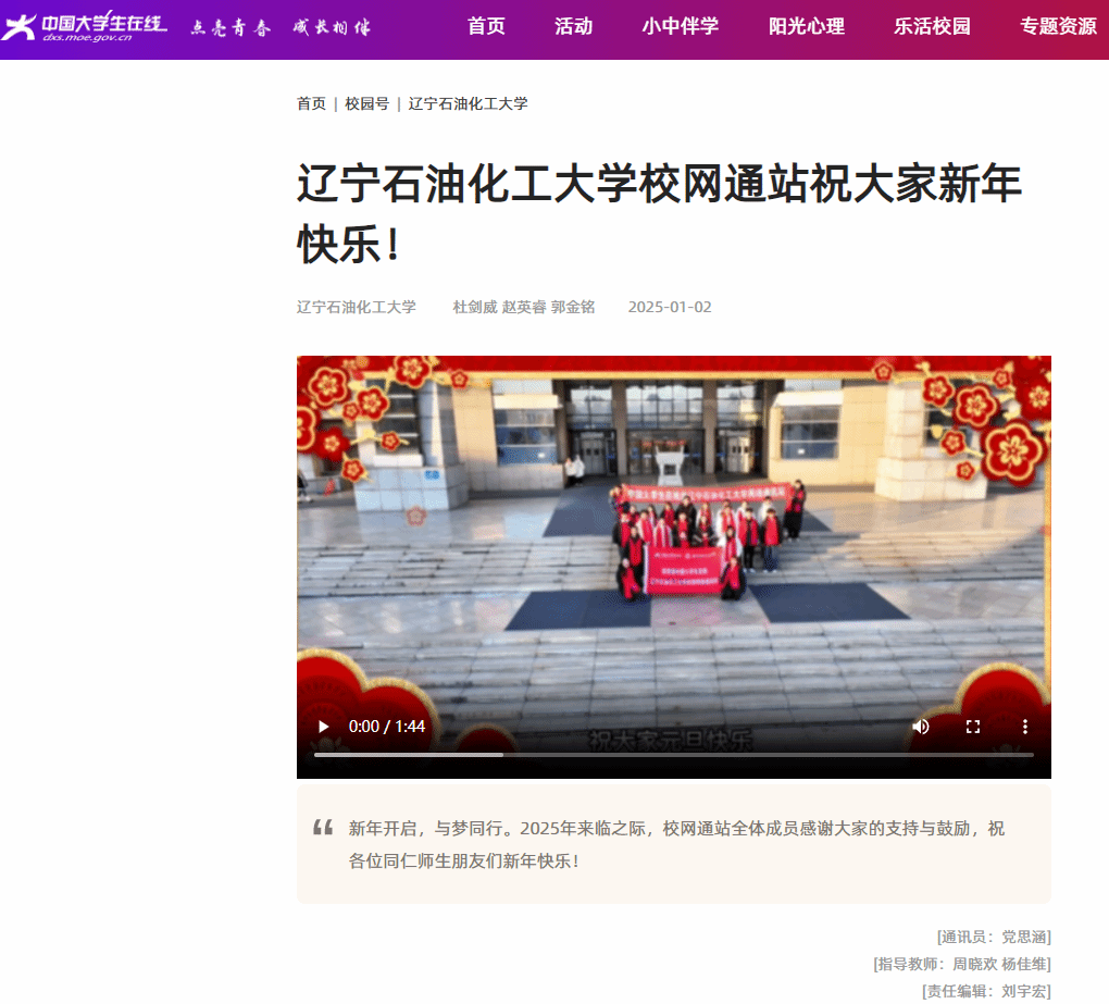 編者按:1月2日,教育部中國大學生在線網站對我校新媒體學生制作的視頻《遼寧石油化工大學校網通站祝大家新年快樂!》進行了宣傳報道。現將相關報道轉載如下: