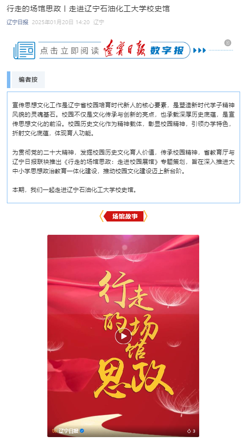 編者按:為深入推進大中小學思想政治教育一體化建設,推動校園文化建設邁上新臺階,省教育廳與遼寧日報聯袂推出《行走的場館思政:走進校園展館》專題策劃。1月20日,遼寧日報微信公眾號、遼望?遼寧日報、遼寧日報微信視頻號對我校校史館進行了宣傳展示。現將相關報道轉載如下: