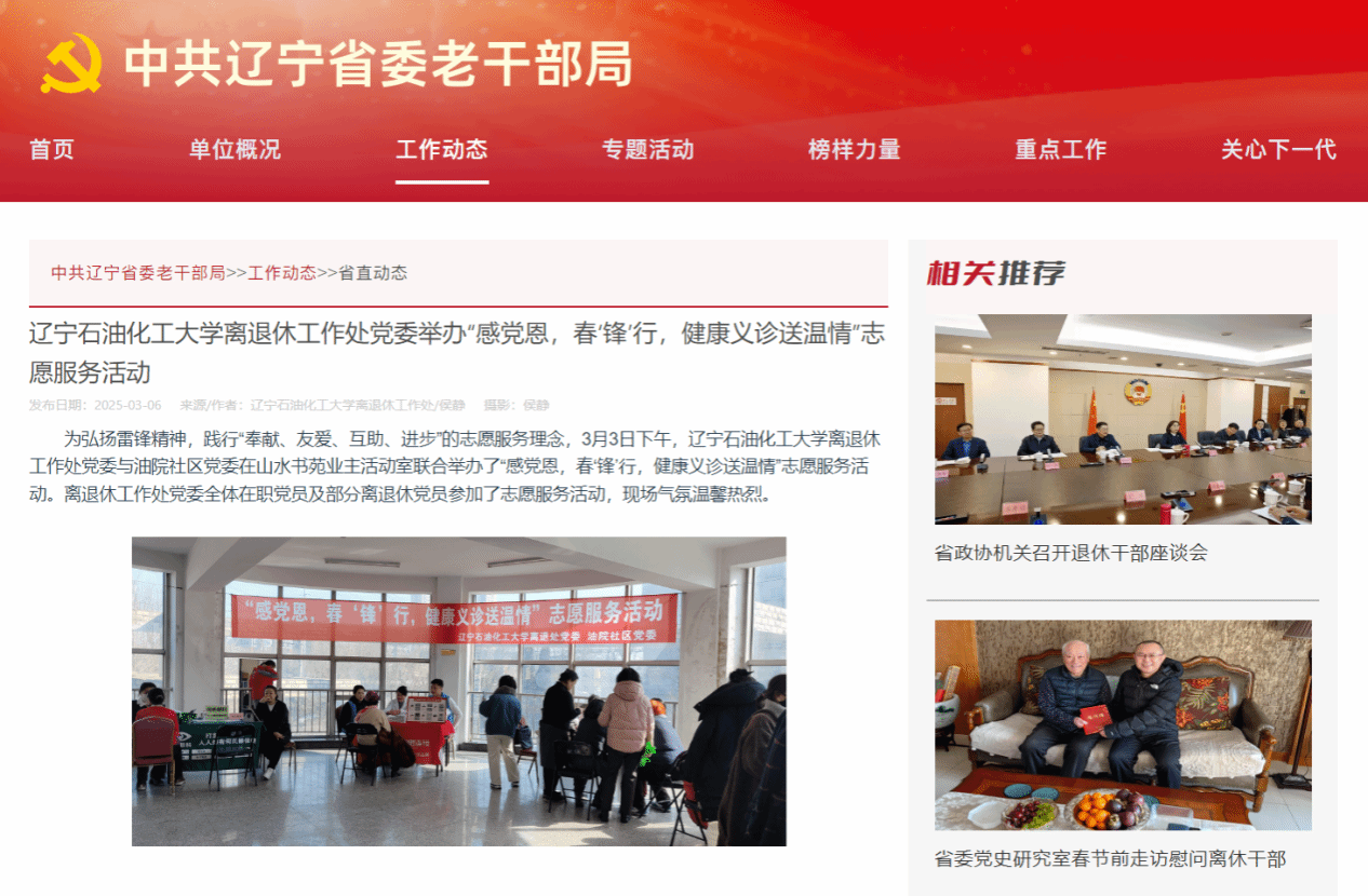 編者按:近日,中共遼寧省委老干部局官網登載了我校離退休工作處撰寫的文章《遼寧石油化工大學離退休工作處黨委舉辦“感黨恩,春‘鋒’行,健康義診送溫情”志愿服務活動》。現將相關報道轉載如下: