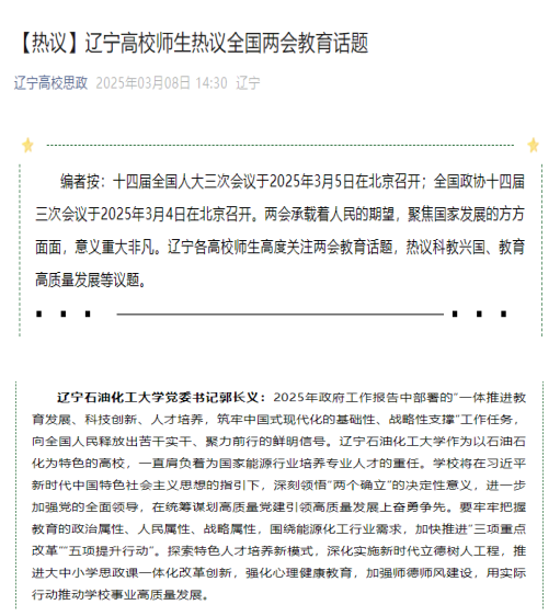 編者按:十四屆全國人大三次會議于2025年3月5日在北京召開;全國政協十四屆三次會議于2025年3月4日在北京召開。兩會承載著人民的期望,聚焦國家發展的方方面面,意義非凡。遼寧各高校師生高度關注兩會教育話題,熱議科教興國、教育高質量發展等議題。3月8日,遼寧高校思政微信公眾號對我校黨委書記郭長義的兩會教育話題熱議進行了組稿宣傳。現將相關報道轉載如下: