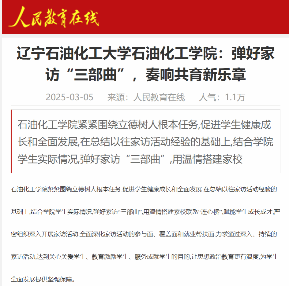 編者按:近日,人民教育在線(客戶端)、中國網、中國晨報網等媒體平臺對我校石油化工學院金維鑫老師撰寫的《遼寧石油化工大學石油化工學院:彈好家訪“三部曲”,奏響共育新樂章》文章進行了轉載報道。現將相關報道轉載如下: